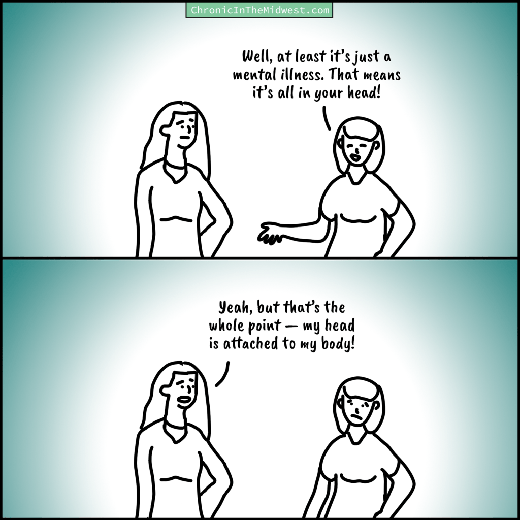 Usually when people say, “It’s all in your head,” they mean that it’s just a situation of “mind over matter”, or they may even think the illness is contrived. Perhaps they aren’t implying that you made it up but simply that you’re “overthinking” or worrying about it too much.