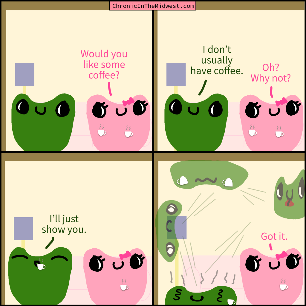 Frame 2: The green frogling says, “I don’t usually have coffee”, to which the pink froglette replies, “Oh? Why not?”
