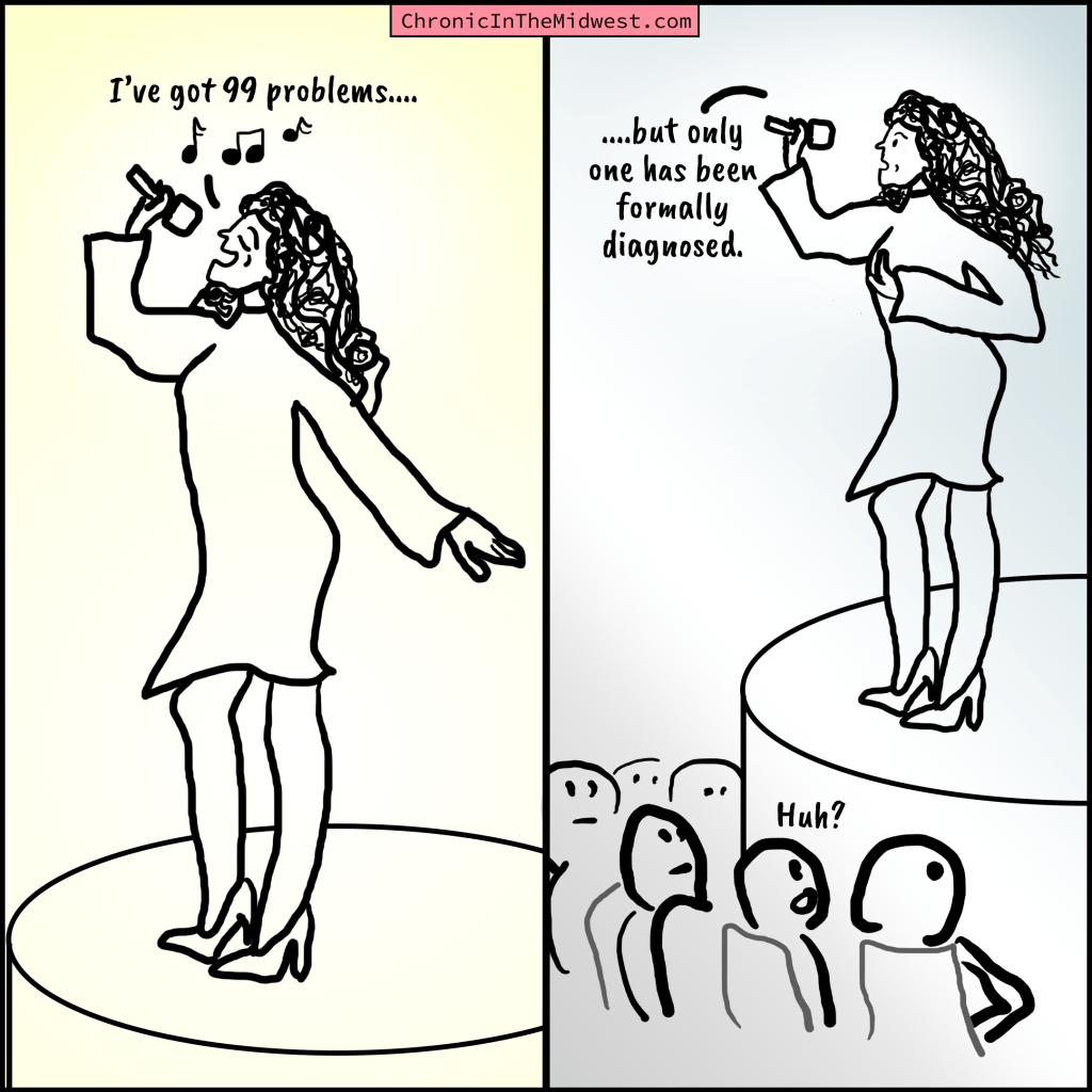 Frame 2: The woman pauses mid-song, holding up one finger, and says, “….but only one has been formally diagnosed.” An audience member says, “Huh?”